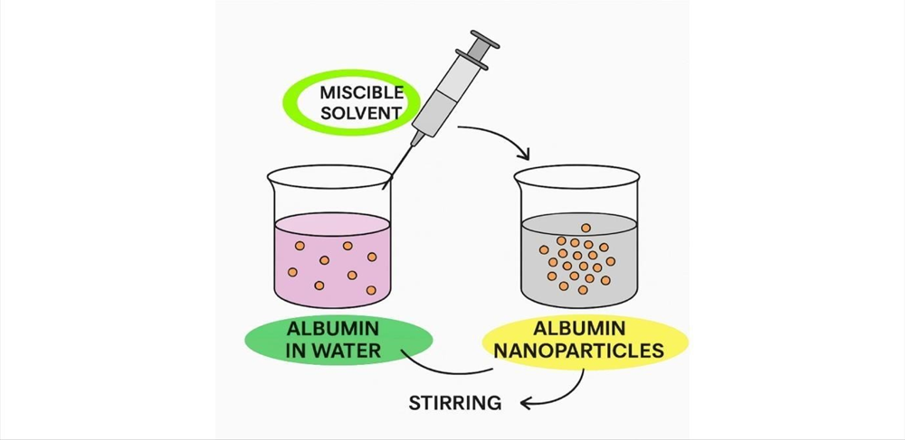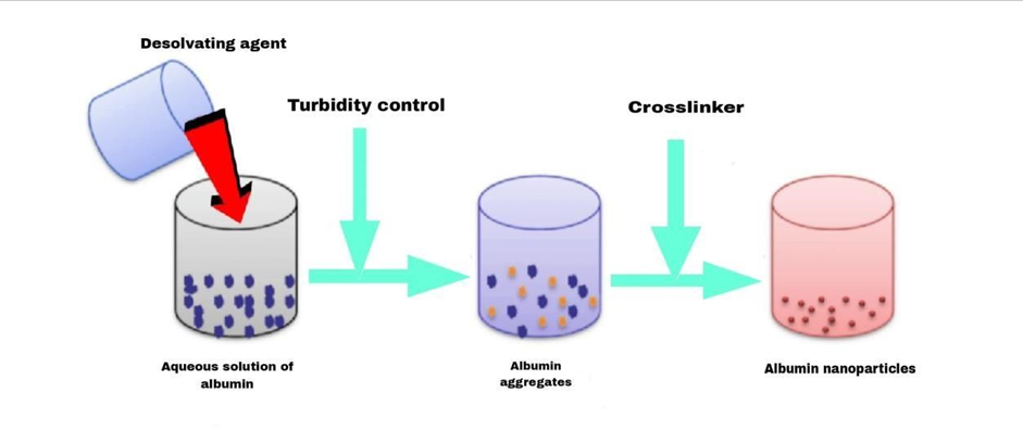 This method involves association of albumin solution with a consonant non-solvent to get nanoparticles formulation. Steps involve in it firstly dissolve albumin in water, (5) after that it injected into a miscible solvent like ethanol with continuous stirring and spontaneously nanoparticles will from. At last stabilization and purification is needed for getting pure albumin nanocarrier and distinguished for size, size distribution, morphology, and other applicable properties36. It contains mild and quick process for preparation of albumin nanoparticles, in this process crosslinking is not required for this formulation.