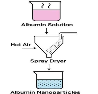 This is a good technique for converting liquid phase into dry powders which is used in the production of albumin nanoparticles. It has advantages such as size, flow behaviour and density which can be altered in this method. The steps involved are atomization transforms the liquid raw material into droplets of tiny size. The droplets are expressed to high temperature which evaporates solvent and solid product is formed due to evaporation from droplet35.