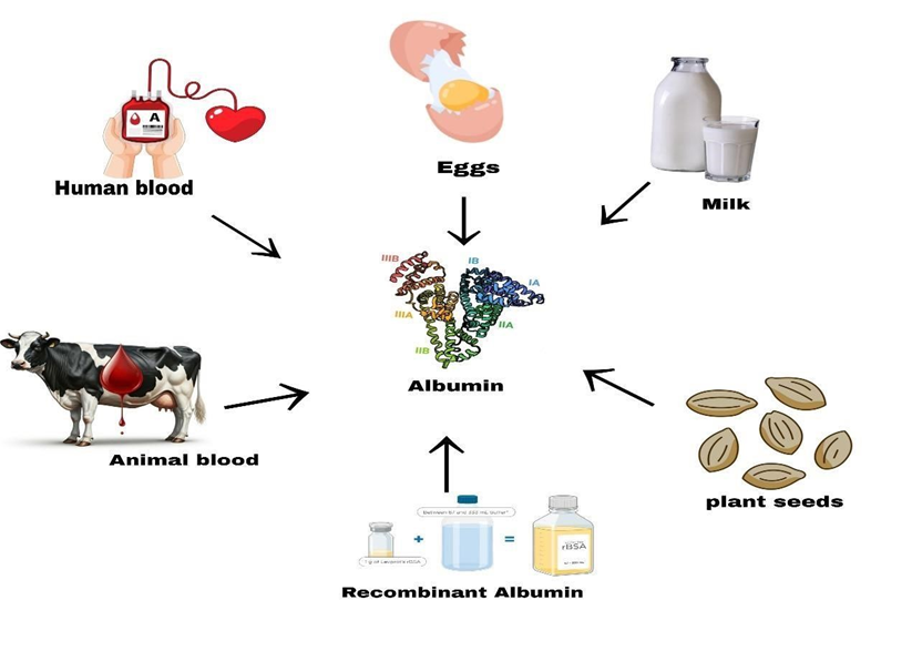 It is a versatile multifunctional protein which is obtained from human serum called as human serum albumin (HSA) ,bovine serum obtained from animal blood termed as Bovine serum albumin (BSA), recombinant human serum albumin (r-HSA) derived from genetic engineering , Ovalbumin and various plant albumins via plant seeds; HSA is largely used as carrier due to its biocompatibility and more safety .BSA is preferred in research and not in human use ,for humans (r-HSA) is predominantly for its non- pathogenic properties ,from milk and egg; lactalbumin and ovalbumin are respectively extracted which is used for research and food industries having their own advantages and disadvantages 2.