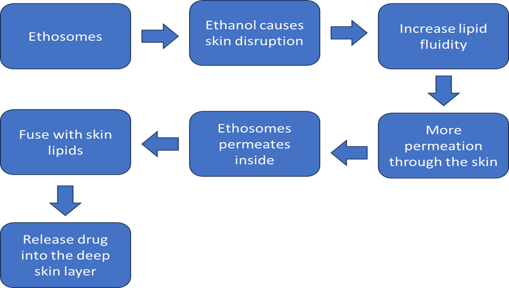 Ethanol and phospholipids synergistic effect makes the per mean ability of ethosomal content through the skin very high. Ethanol makes the lipids more fluid both in the membrane of the vesicle and in the layer of the stratum corneum and this helps the vesicular encapsulated drug to go deeper into the skin. [29],