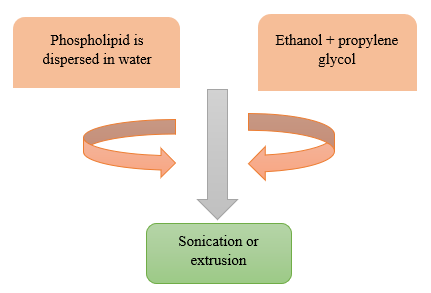 Phospholipid is dispersed in water and heated to 40°C in a water bath until a colloidal solution forms. Separately, ethanol and propylene glycol are mixed and heated to 40°C. Once both phases reach the target temperature, the organic phase is added to the aqueous phase. The drug is dissolved in water or ethanol based on its solubility. Vesicle size can be reduced using probe sonication or extrusion.