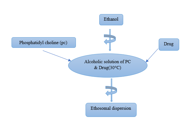 Ethanolic liposomes, are called as Ethosomes, are non-invasive, flexible, and pliable vesicular delivery systems. They enhance the distribution of active ingredients by facilitating the penetration of medication into the deep skin layer. Ethosomes are lipid vesicles containing phospholipids, alcohol (ethanol or isopropyl alcohol), and water, developed by Touitou. They enhance skin drug delivery, with penetration improved by additives like propylene glycol. Age-activator agents, such as ethanol and sodium cholate, boost carrier penetration through the stratum corneum, enabling effective local and systemic delivery of both hydrophobic and hydrophilic drugs. Ethosomes are widely recognized for their efficacy in transdermal drug delivery. Key components include phospholipids, alcohol, cholesterol, polyglycol, dye, and the vehicle. They can encapsulate drugs with hydrophilic, lipophilic, or amphiphilic properties. These soft, malleable vesicles deliver drugs to deep skin layers or systemic circulation. Ethosome sizes range from nanometers to microns.