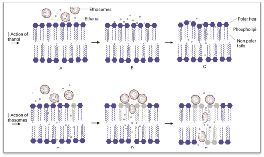 Ethanol effect: Ethanol function as an effective penetration when applied to the skin. Its mechanism of action in enhancing permeation is well-documented. Ethanol penetrates the intercellular lipid domains of the stratum corneum, where it increases the fluidity of lipid bilayers. This results in a reduction in the structural order and density of the lipid multilayers within the cell membrane. Consequently, the barrier function of the skin is temporarily disrupted, facilitating the enhanced permeation of active compounds through the skin. Effect of ethosomes: Ethosomes enhance cytomembrane lipid fluidity due to the presence of ethanol, which increases skin permeability. As a result, ethosomes can penetrate easily into the deeper layers of the skin. Once inside, they interact with skin lipids and facilitate the release of the encapsulated drug into the deeper skin layers.