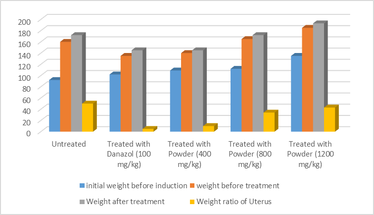 Weight of animals were determined before induction. After the 30-day treatment period, animals were weighed, before they were sacrificed and dissected to obtain the intact uterus. The uterus was observed, weighed and the uterine/body weight ratio determined.