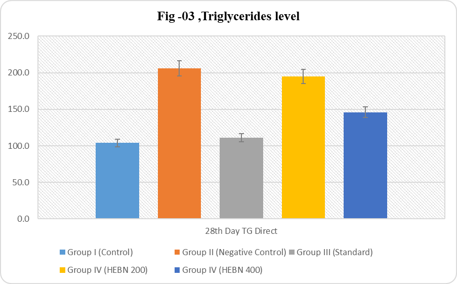 As the results of the study showed that the LDL-C at the 28th day increases significantly as compared to the normal control group. Similarly, group V HEBN 400 mg/kg has shown (Table .02) a highly significant decrease in the LDL level compared to the negative control group, whereas group IV HEBN 200 mg/kg has not shown a significant difference compared to the negative control group. These findings suggest that the administration of HEBN may have a beneficial effect on lipid profiles, particularly at the higher dosage. Further research is necessary to understand the underlying mechanisms and to explore the potential clinical implications of these results. In the same way, the study showed (Fig 03.) that the triglyceride level increased in all induction groups after treatment; both Group IV and Group V have found a significant decrease in the triglyceride level compared to the negative control group. This suggests that the treatments applied in these groups may be effective in managing triglyceride levels, potentially offering a therapeutic benefit for individuals with elevated levels.