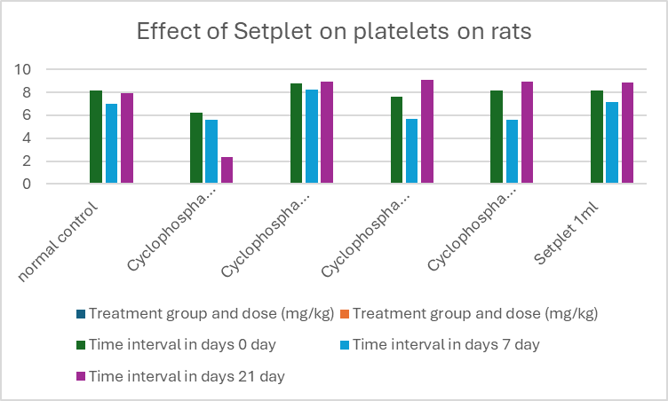 Albino SD rats (weighting between 200–250 g) of either sex were divided into five groups, each consisting of ten rats. Group I received normal saline from day 1 to day 21 and served as the normal control group. Group II received cyclophosphamide (25 mg/kg, intraperitoneally) from day 1 to day 3, followed by normal saline (1 ml/kg, orally) from day 4 to day 21, serving as the toxic control group. Groups III and IV also received cyclophosphamide (50 mg/kg, intraperitoneally) from day 1 to day 3, followed by Setplet (0.2 ml, 0.4 ml, and 1 ml, orally, respectively) for 21 days, serving as the treatment groups. Blood samples were collected 1 hour before the start of the experiment, and again on days 7 and 21 after administration of Setplet. The blood was drawn from the retro-orbital plexus of the rats under light anaesthesia, using glass capillaries, and was stored with disodium ethylenediaminetetraacetate for biochemical parameter estimation. Total platelet count (PC), Total leucocyte count (TLC), and Differential leucocyte count (DLC) including Neutrophils, Lymphocytes, Monocytes, Eosinophils, and Basophils were measured. The rats were closely monitored for general activity, fur condition, food and water intake, changes in weight, and mortality rate. The animals were weighed daily for 21 days.