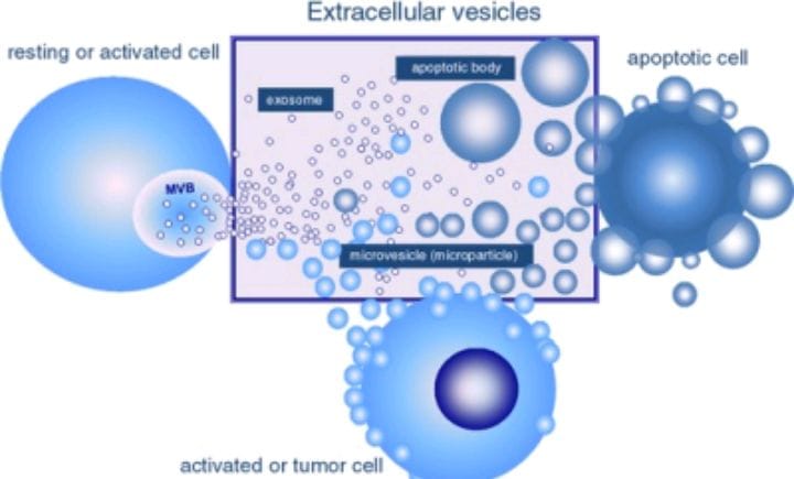 Cells mainly communicate with one another through chemical messengers, most notably extracellular vesicles (EVs). In recent years, extensive research has focused on the potential of EVs in therapeutic medicine development. Their distinct structural characteristics enable them to be modified to transport particular biomolecules like lipids, proteins, and nucleic acids—including messenger RNA (mRNA), microRNA (miRNA), other small non-coding Genomic DNA (gDNA) and RNAs are derived from the parent cell. Depending on their cellular EVs are typically divided into three primary categories based on their size and origin: (a) exosomes (30–150 nm in diameter), (b) microvesicles or ectosomes (50 nm–1 µm), and (c) apoptotic bodies (50 nm–5 µm).[1] Extracellular vesicles (EVs) are membrane-bound lipid particles that are released by cells into the surrounding extracellular environment[2,3] The origin, release mechanisms, size range, molecular makeup, and biological functions of the three main subtypes of extracellular vesicles (EVs)—microvesicles (MVs), exosomes, and apoptotic bodies—are categorized. [2,4]