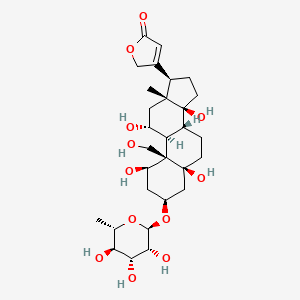 IUPAC Name: 3-[(1R,3S,5S,8R,9S,10R,11R,13R,14S,17R)-1,5,11,14-tetrahydroxy-10-(hydroxymethyl)-13-methyl-3-[(2R,3R,4R,5R,6S)-3,4,5-trihydroxy-6-methyloxan-2-yl]oxy-2,3,4,6,7,8,9,11,12,15,16,17-dodecahydro-1H-cyclopenta[a]phenanthren-17-yl]-2H-furan-5-one Mol. Formula: C29H44O12 Mol. Wt: 584.7 g/mol Physical Description: Quabain is seen as odorless, white crystals or a crystalline powder in its octahydrate form. It is used to induce rapid digitalization in cases of acute congestive heart failure and is also recommended for treating atrial or nodal paroxysmal tachycardia and atrial flutter. Melting Point: 392 °F |