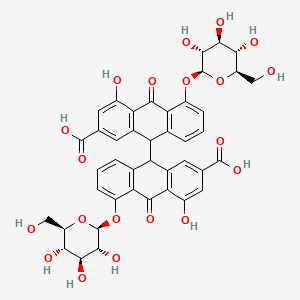 IUPAC Name: 9-[2-carboxy-4-hydroxy-10-oxo-5-[(2S,3R,4S,5S,6R)-3,4,5-trihydroxy-6-(hydroxymethyl)oxan-2-yl]oxy-9H-anthracen-9-yl]-4-hydroxy-10-oxo-5-[(2S,3R,4S,5S,6R)-3,4,5-trihydroxy-6-(hydroxymethyl)oxan-2-yl]oxy-9H-anthracene-2-carboxylic acid Mol. Formula: C42H38O20 Mol. Wt: 862.7 g/mol Physical Description: A yellow-brown powder with a subtle odor and taste, and only slightly soluble in water. Melting Point: 189°C to 225°C