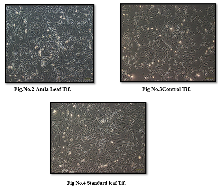 The MTT test was used to evaluate the cytoprotective effect on L929 fibroblast cells treated with varying doses of the extract (20–100 µg/mL) 12. High cell viability in amla leaf extract suggested good cytoprotection and low cytotoxicity 13.Cell vitality at 100µg/mL was 72.30 percent, but cells treated with normal ethanol only displayed 16.85% viability. The extract showed a protective effect against oxidative stress-induced cell death by preserving over 70% cell viability even at higher concentrations.