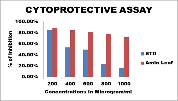 According to the current study, the high concentration of bioactive substances in Phyllanthus emblica (amla) leaf extract, such as polyphenols, flavonoids, tannins, and ascorbic acid, results in notable cytoprotective effects. Comparing samples treated with the amla leaf extract to the standard medication ethanol, the results indicated great cell viability, demonstrating the extract's efficacy in shielding cells from oxidative damage. These results imply that the extract has the capacity to improve cellular integrity and encourage survival under stressful situations. It suggests the cytoprotective characteristics of the sample.