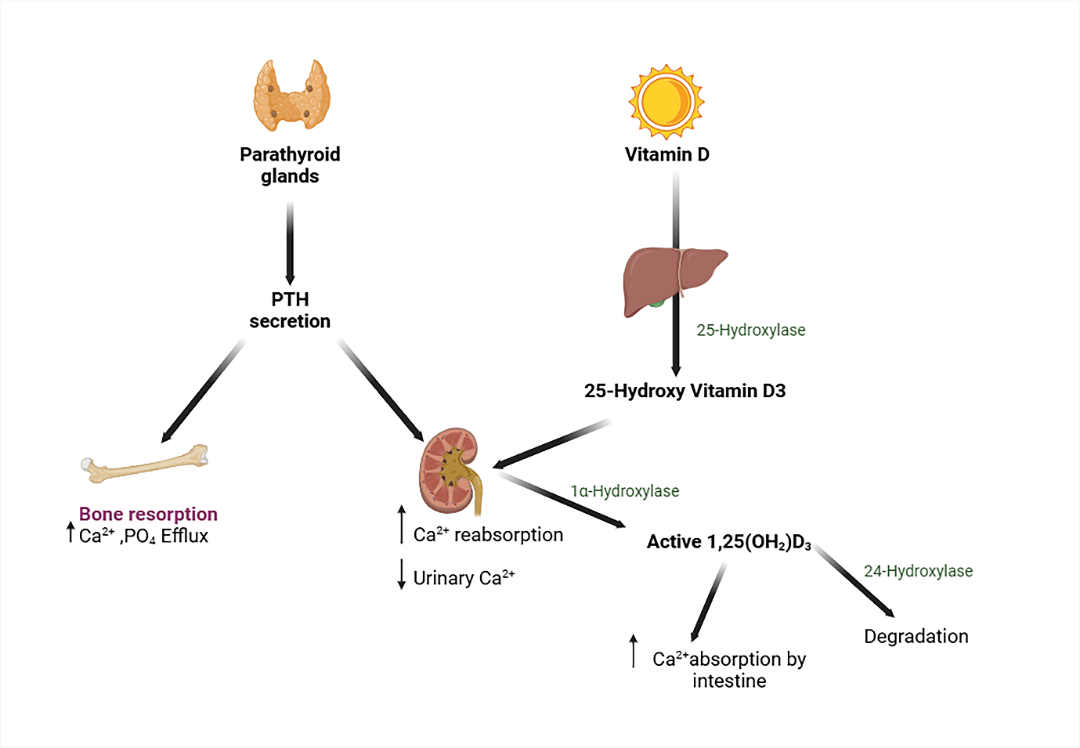 Serum calcium levels are recognized by the calcium-sensing receptor (CaSR) on parathyroid cell surfaces. CaSR signaling suppresses PTH secretion. This inhibition is alleviated when serum calcium or magnesium levels are low, allowing for PTH secretion. PTH stimulates bone resorption and calcium release, whereas kidneys reduce calcium excretion. PTH1R stimulates NaPi-IIa internalization in kidney proximal tubules, reducing phosphate absorption and altering CYP27B1 and CYP24A1 expression, leading to 1,25(OH)2D3 production. Vitamin D is activated through hydroxylation by 25-hydroxylase (CYP2R1) in the liver and 1α-hydroxylase (CYP27B1) in the kidney, resulting in active 1,25(OH)2D3 that binds to the vitamin D receptor. Inactivation requires 24-hydroxylase (CYP24A1). FGF23 is released by osteocytes and binds to the FGFR-klotho complex in kidney proximal tubules. This lowers PTH transcription and plasma membrane expression of NaPi-IIa and NaPi-IIc, leading to increased phosphate excretion. FGF23 inhibits CYP27B1 and stimulates CYP24A1, resulting in decreased 1,25(OH)2D production (Figure 4) [18].