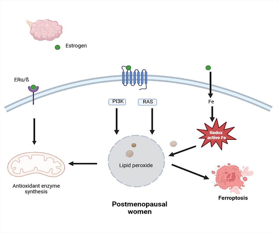 Fig. 3: Oxidative stress in a high-risk osteoporotic population. postmenopausal women. Estrogen receptors and G-protein-coupled estrogen receptor-1 trigger an intracellular antioxidant response. Estrogen insufficiency caused lipid peroxide buildup and promoted ferroptosis.