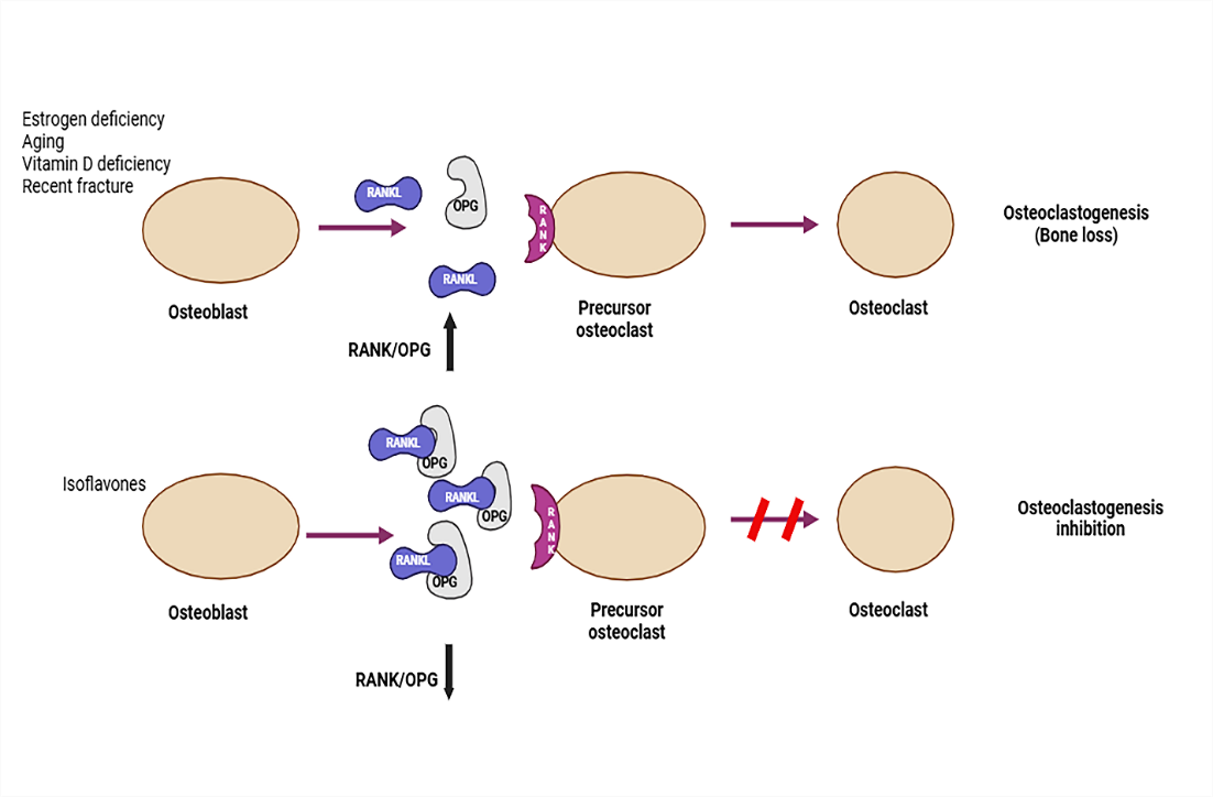 Fig. 2: Regulation of Osteoblast and Osteoclast Activity. Osteoporotic fractures are linked to aging, estrogen deficit, vitamin D deficiency, and prior fractures. Bone homeostasis relies on the OPG/RANKL balance. RANKL activates osteoclasts, promoting bone resorption. Soy isoflavones lower the RANKL/OPG ratio, inhibiting osteoclastogenesis and fostering bone formation.