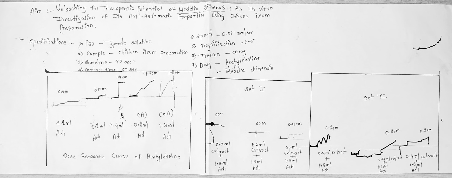 The contractile effect of acetylcholine was prevented by Wedelia chinensis on chicken ileum tissue preparation, and we obtained the opposite effects to those of acetylcholine on chicken ileum preparation. Normally, acetylcholine (Ach) causes contraction of the chicken ileum smooth muscle by increasing the tone and contractility of the ileum muscle, by stimulating the muscarinic receptors (M3) in the ileum, leading to increased intracellular calcium and muscle contraction. Compared to that of Ach, the plant extract of Wedelia chinensis produced relaxation of the ileum smooth muscle by blocking the acetylcholine-induced contractility. Thus, plant extract dose samples decrease the tone of the ileum muscle and block the muscarinic receptors (M3) in the ileum, leading to decreased intracellular calcium and muscle relaxation. In the presence of Wedelia chinensis, the effects of acetylcholine are antagonized, and the ileum muscle relaxes. These results may be due to the phytoconstituents present in the plant extract binding to the muscarinic receptors (M3), blocking the action of acetylcholine. The standard preparation of Acetylcholine produces a contraction of chicken ileum tissue preparation and Wedelia chinensis shows the relaxation, which indicate the antagonistic property of Wedelia chinensis on the same isolated tissue preparation. These results suggested the antiasthmatic property.