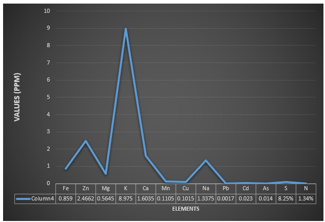 Fatty acids are essential compounds in man’s diet, and their esterification with glycerol molecules give rise to the main constituents of fats and oil, (Ahmad, 2017). The WHO recommends a daily fat intake equivalent to 20%-35% of total daily energy, (Eilander et al., 2015). The results of the determination of fatty acid profile of G. latifolium leaf shown in Table 1, indicated that oleic acid (C18:1) was the fatty acid with the highest value of 21.611 ± 0.664 µg/mL. Oleic acid is a monounsaturated fatty acid which has beneficial effects on cancer, autoimmune and anti-inflammatory diseases beside its ability to facilitate wound healing, (Sales-Campos, 2013). Also, in Table 1, palmitic acid (16:0) content of the G. latifolium leaf was 16.05 ± 0.677 µg/mL which was next in concentration to oleic acid. Although, palmitic acid is a saturated fatty acid but it has health benefits which includes supporting skin health, anti-inflammatory effects and potentially metabolic health benefits. On the other hand, too much of palmitic acid in proportion to other healthy fatty acids may increase the risk for cardiovascular disease, (Levy, 2020). The concentration of palmitc acid in this study was lesser than 36% of the total fatty acid obtained by Eleyinmi, (2007). Mystric acid was 14.508 ± 1.355 µg/mL as seen in Table 1. It showed that mystric acid (C14:0) was the third highest fatty acid in terms of concentration. It is a saturated fatty acid. Other fatty acids that were reasonably present in G. latifolium leaf were linoleic acid: 12.802 ± 1.660 µg/mL (C18:2), palmitoleic acid: 12.221 ± 0.380 µg/mL (C16:1) and the least contained fatty acid was docosahexaenoic acid: 7.260 ± 0.604 µg/mL (C24:0). WHO, (1996), stipulates that the replacement of saturated fatty such as palmitic acid by polyunsaturated fatty acids decreases low-density lipoprotein cholesterol levels and total cholesterol/high density lipoprotein acids rich diet decreases the risk of coronary heart disease. The total oil content of the G. latifolium leaf was 2.9835 ± 0.9417%. The amount of oil obtained in this study was higher than 0.3-1.25% obtained from the fresh leaves of allspice, (Krishnamoorthy, 2004). Generally, in Table 1, the total amount of saturated fatty acids content of G. latifolium leaf (72.0771 µg/mL) was higher than (46.6336 µg/mL) of unsaturated fatty acid in the plant leaf. However, these values in percentage were higher than what Eleyinmi, (2007), obtained in his work on chemical and antibacterial of G. latifolium leaf. He obtained 50.2% and 39.4% of saturated and unsaturated fatty acids respectively in the oil. Fatty acids are widely used as inactive ingredient in drug preparations and are used in lipid formulation as the carriers for active substance. In Table 2, the components isolated from the aqueous extract of G. latifolium leaf were four active components. The first component identified showed gray colour, with a retention factor (Rf) of 1.24 cm and a mean concentration of 3.15 ± 0.685 cm. The gray colour happens to be the least migrated component, followed by the component with yellow colour with the Rf value 1.32 cm and a mean concentration of 2.05 ± 0.212 cm. Green component had Rf value of 1.36 cm and a mean concentration of 3.70 ± 0.565 cm. Finally, brown colour was the most migrated with Rf value of 1.40 cm, and a mean concentration of 3.60 ± 0.848 cm. According to Ahmad and Wudil, (2013), the active components obtained from the TLC separation of Gongronema latifolium (Utazi) leaf was higher in aqueous extract than ethanol extracts. This was supported by Ezekwesili-Ofili and Okaka, (2019), who reported that the polarity of solvents can raise the solubility of active components. Hassan et al., (2015); Ismail et al., (2015), obtained Rf value of 0.86 cm with green colour of the TLC analysis of the leaves and flowers extract of senna siamea lam using ethyl acetate. Moreso, Sangeeta and Vrunda, (2016), disclosed the presence of flavones, flavonols, biflavonyl, kaempferol, etc., in the chromatographic separation of flavonoids in extracts of moringa and ocimum (leaf and flower). However, the disparity in the TLC separation could be due to the polarity differences of the solvent used for extraction and the solvent mixtures used for the TLC separation. But from the results of this study, the TLC analysis has given an idea of the components present in G. latifolium leaf, which may not have been exhaustively separated. The results of the elemental analysis presented in Figure 1, showed that K was highest contained element with a value of 8.975 ppm, followed by S; (8.245 %), Zn; (2.4663 ppm), Ca; (1.6035 ppm), N; (1.344 %), Na; (1.3375 ppm), and Fe; (0.859 ppm), respectively. The least contained elements according to Figure 1, were Mg; (0.5645 ppm), Mn; (0.1105 ppm), Cu; (0.1015 ppm), Cd; (0.023 ppm), As; (0.014 ppm), and Pb; (0.00165 ppm), respectively. Nwamkezie and Obiakor-Okeke, (2014), obtained 7.83mg/100g of Fe, 54.60 mg/100g of Mg, 78.5 mg/100g of K, and 68.30mg/100g of Ca respectively. In a study by Adeyeye et al., (2020), G. latifolium leaf contained 13.3 mg/100g of Fe, 4.71 mg/100g of Zn, 548 mg/100g of Mg, 659 mg/100g of K, 304 mg/100g of Ca, 1.91 mg/100g of Cu, 44.7 mg/100g of Na, 0.00016 mg/100g of Pb and 0.0008 mg/100g of Cd respectively. More so, Usoro et al., (2018), opined that G. latifolium leaf contained 471±12.08 mg/kg of K, 0.397±0.07 mg/kg of Zn, 143.8±8.13 mg/kg of Na, 130±7.45 mg/kg of Ca, 133±5.02 mg/kg of Mg, 1142±14.21 mg/kg of Fe, 0.16±0.009 mg/kg of Pb, and 0.23±0.003 mg/kg of Cd, respectively. In a similar vein, according to Roszyk, (2005), the mean sulphur content of chrysanthemum leaf ranged between 0.25 and 0.45 %, and this was further buttressed by Macz et al., (2001a), that the leaf sulphur concentration of 0.3-0.5 % is the acceptable limits. However, it is evident that the various result findings showed a similar trend in the concentration of the elements.