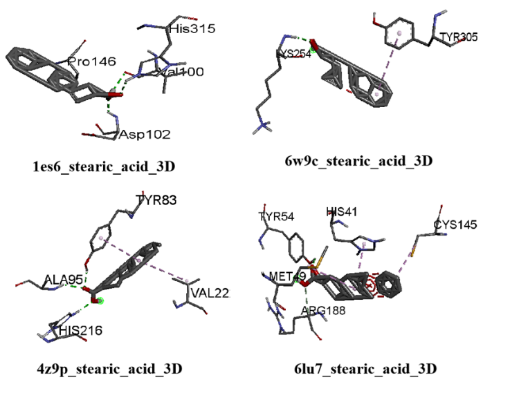 From the above analysis it is clear that stearic acid possesses highest band gap and highest LUMO energy levels which is responsible for showing highest activity against two different targets in the docking analysis as shown Table 6.
