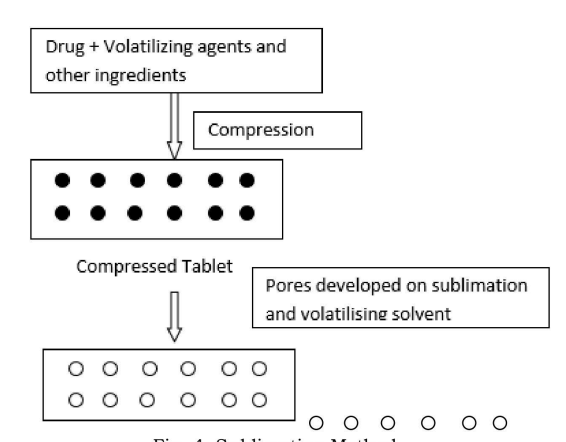 In order to achieve rapid disintegration and dissolution, inert solid components that volatilize capidly, such as urea, camphor urentomium carbonate, amenonium bicarbonate, & hexametnyiane-totramine, are formulated into porous moss mass. They were compressed after being combined with additional substances. By providing a slight temperature change and reducing pressure, the volatile substance is transformed into a porous mass. The sublimation method's properties include its porous nature and its compatibility with solvents such as cyclohexane and hensene. The figure 4 below provides an explanation of sublimation. [34,49]