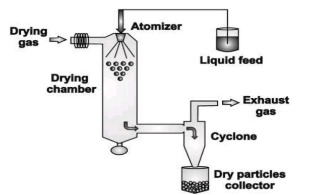 Nitrogen can be utilized if the liquid is a flammable solvent, such as ethanol, or if the finished product is oxygen sensitive, even though air is the hot drying medium. Every spray dryer disperses the liquid or slurry into a fine mist using an atomizer or spray nozzle. The figure 3 shows how this operates.[23]