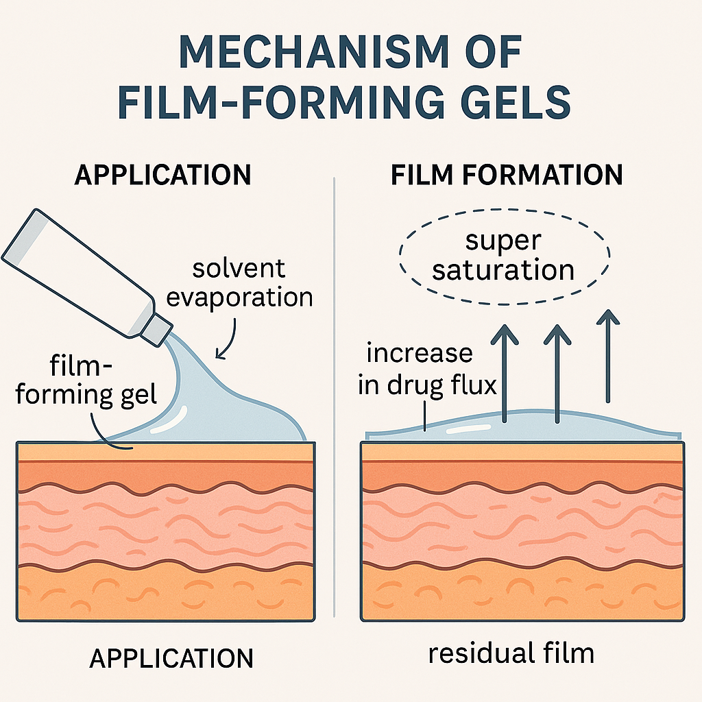 Film forming gels offer a promising and novel advancement in topical and transdermal drug delivery systems by providing controlled, prolonged release, enhanced patient adherence, improved bioavailability and ease of application. Their ability to form thin, flexible, transparent film ensures effective drug permeation, stability, aesthetic acceptability and comfort. Polymers, solvents, and plasticizers can be carefully formulated to optimize these systems for a diverse range of therapeutic and cosmetic applications. Ongoing research and developed in this area will further expand their application, ensuring.