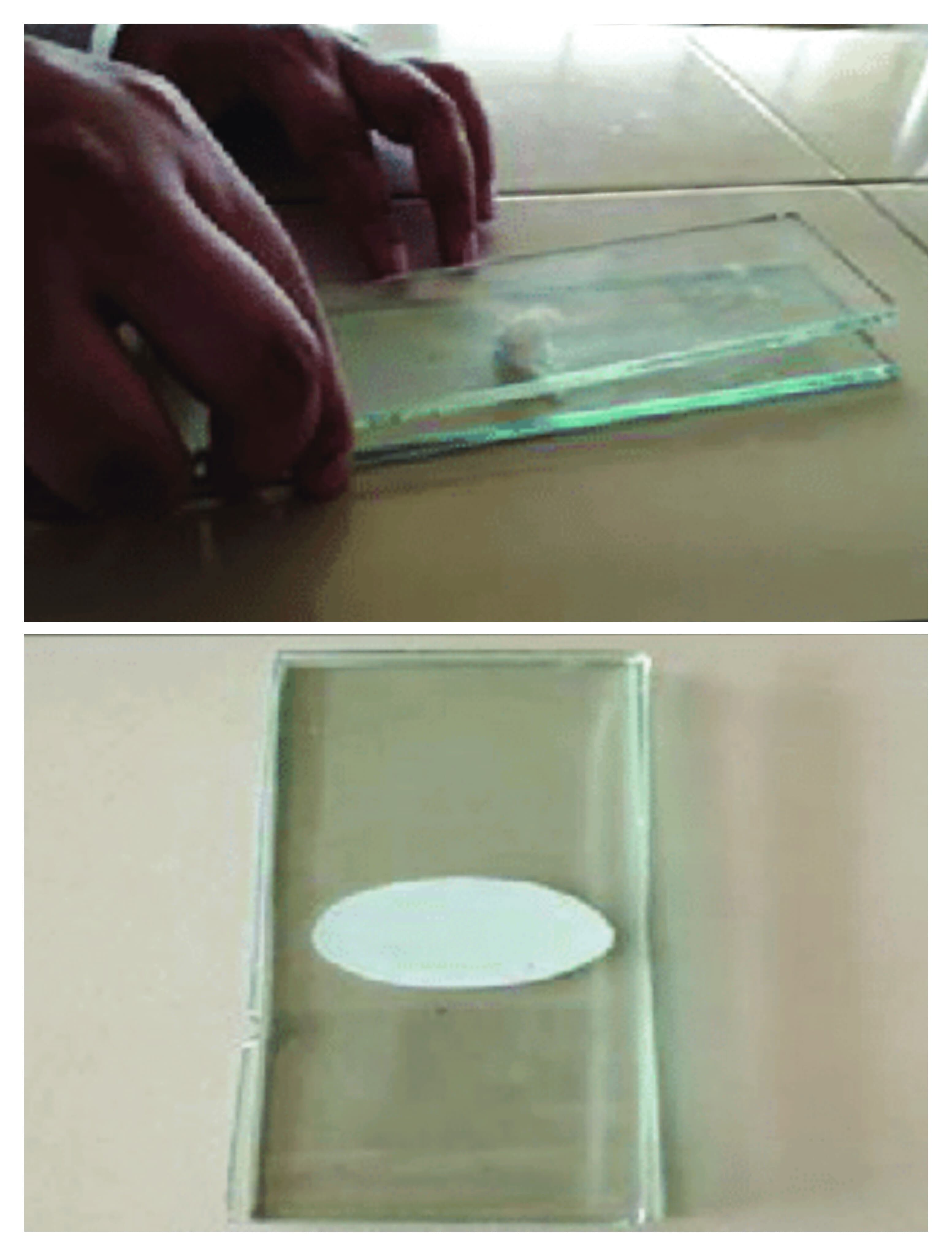 Spreadability is expressed in terms of time in seconds determined by glass slide and wooden block apparatus. About 20 gm of weight was added to the pan and the time for upper slide to separate completely from the fixed slide was noted. An excess amount of cream about 2 gm under study was placed on the ground slide. The cream was sandwiched between two slides. One glass slide was fixed on ground and another was provided with the hook. 1 kg weight was placed on the top of slides for 5 minutes in order to form uniform film of cream and to remove air between the slides. Excess of the cream was wiped off from the edges. The top plate was then subjected to pulley with the help of string attached to the hook. The time in seconds required by the top slide to move a distance of 7.5 cm was noted. A shorter or less time interval indicated better spreadability. Spreadability of cream was calculated using the formula.
