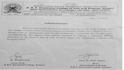 he herbarium of these plants was identified and authenticated by Dr. Randive. S.D and Professer Dr. M.N Jagtap,P.G department of botany and research center Solapur.