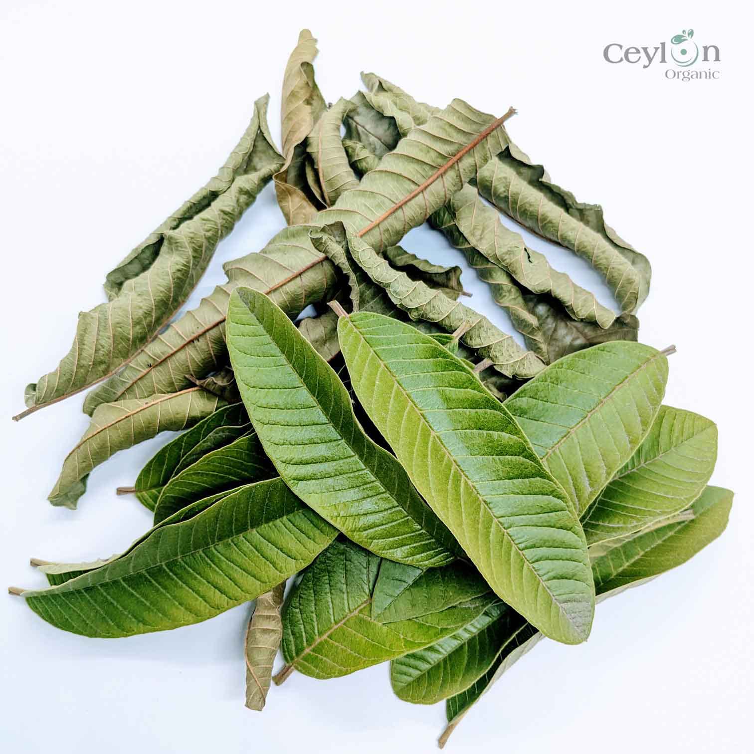 Guava leaves are shaped somewhere between oval and oblong, typically measuring 7 to 15 centimeters in length and 3 to 5 centimeters in width. They grow in pairs directly across from each other On the stem are attached by short stalks called petioles. The leaves have tough, leathery texture with a broad surface, Dark green color and subtle white veins. Some leaves may also show light Brown spots. When crushed guava leaves give off a fragnant, smell similar to the guava fruit. These leaves grow on a small tree with spreading branches and bark that peels away in flakes, revealing the greenish layer underneath.[3]