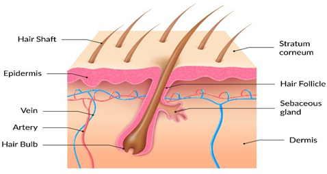 Despite its seemingly simple appearance, a hair strand is one of the body's most intricate structures. Hair consists of two distinct structural components. The area beneath your skin is called the hair follicle, and the area visible above it is called the hair shaft. 95% of hair is made of keratin. Ectoderm from the skin gives rise to vital body parts like hair, nails, and the sebaceous and sweat glands. Hair also serves as a protective covering for the body. Because they are derived from the epidermis during embryological development, they are also known as epidermal derivatives. Your hair grows and is held in place in the hair follicle. At the bottom of the follicle, a piece of tissue called the papilla contains tiny blood vessels. [1]