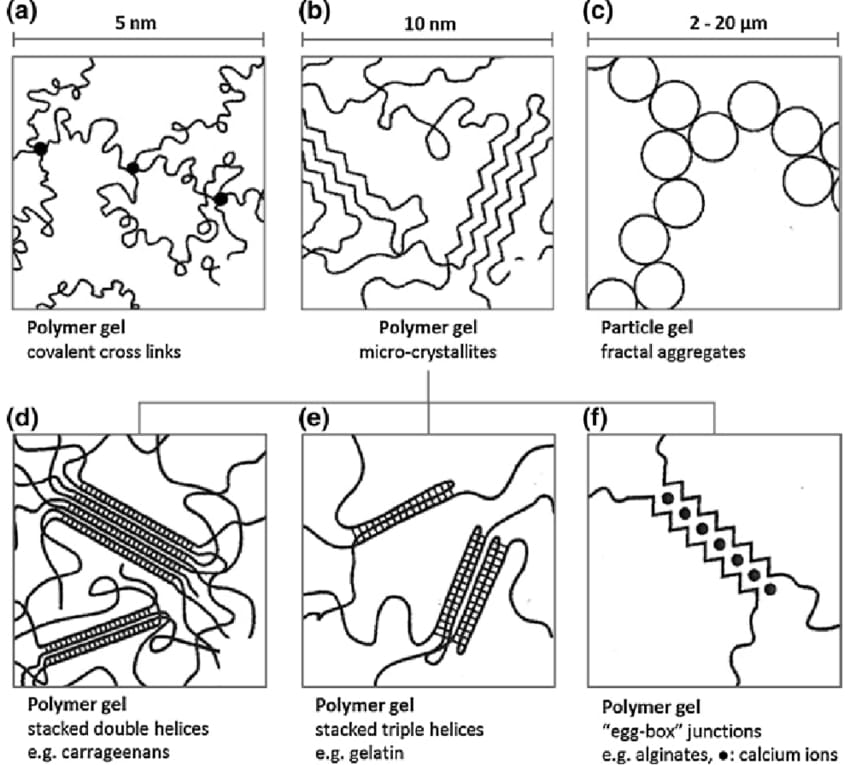 Elastic gels occur at the junction, with relatively weak interactions such as hydrogen bonds and dipole attraction maintaining the fibrous molecules together. These include alginates, guar gum, and agar gels.(13)