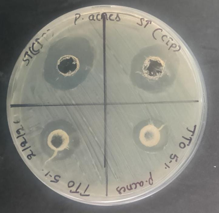 The antibacterial activity of F2 was conducted against Propionibacterium acnes and compared to the standard ciprofloxacin (Cip). The results demonstrated that F2 exhibited a measurable zone of inhibition (16 mm) indicating moderate antibacterial activity against Propionibacterium acnes. The standard drug ciprofloxacin produced a larger inhibition zone (26 mm), reflecting its higher antibacterial potency compared to the test formulation. Although the antibacterial activity of F2 was lower than that of the standard antibiotic, the observed inhibition suggests that F2 possesses appreciable activity against P. acnes.