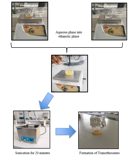 The aqueous phase was then slowly added to the ethanolic phase with continuous magnetic stirring. The resulting mixture was further processed by sonication using an ultrasonicator to reduce vesicle size and obtain a uniform transethosomal dispersion.