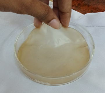 Weigh 0.50g of HPMC and 0.25g of Carbopol 934 in a beaker and combine with 10ml solvent containing distilled water and ethanol in the ratio of (1:1). Then continuously stir it over a hot water bath until the mixture dissolves. Once the temperature attained (250C) add Centella asiatica and eggshell membrane in the ratio 70:30 then glycerol and propylene glycol (0.5ml) were added. Then this was transferred into a glass petri dish and kept for 24hrs without any disturbance. After 24 hrs the prepared transdermal patch was carefully removed from the petri dish and stored. [13,14].