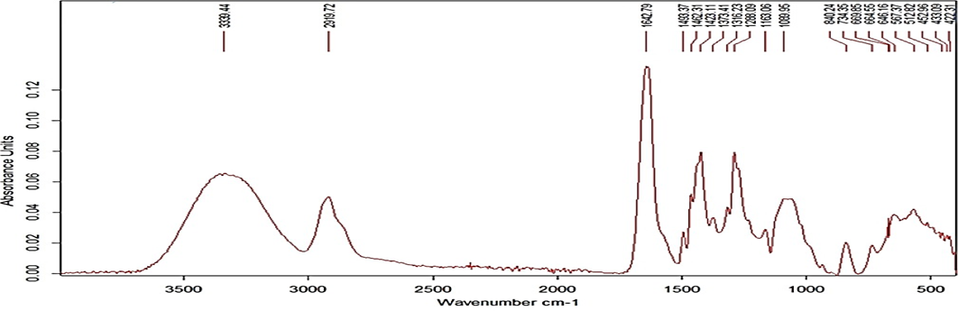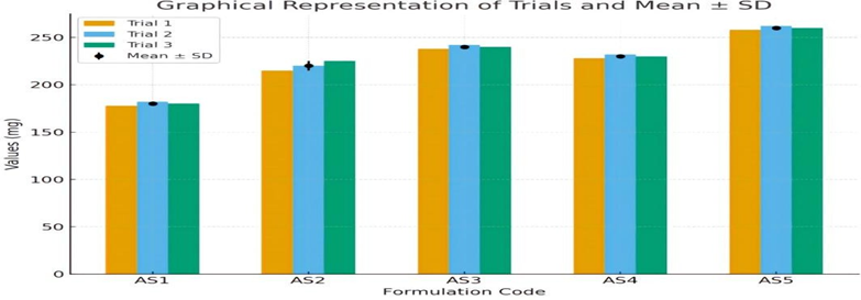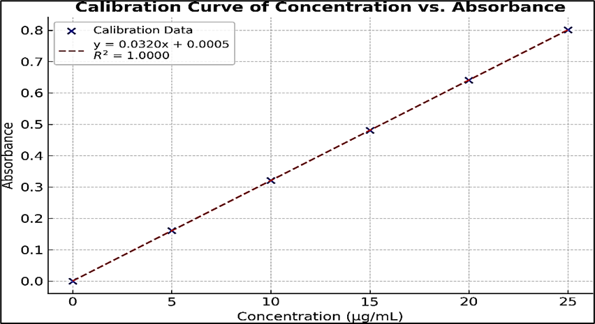 A calibration curve of Astragaloside IV was constructed using the UV–visible spectrophotometric method. Precisely 50 mg of Astragaloside IV was weighed and transferred into a 50.0 mL volumetric flask, dissolved in HPLC-grade methanol, and diluted to volume to obtain a stock solution of 1000 µg·mL?¹. The stock solution was stored at 2–8 °C and protected from light. The UV spectrum of the stock solution was scanned between 200 and 800 nm using a Shimadzu UV-2450 spectrophotometer, The Maximum absorption wavelength (λ max) was identified. From the stock, working standard solutions of 5, 10, 15, 20 and 25 µg·mL?¹ were prepared from the stock by appropriate dilution in methanol; all solutions were filtered through 0.22 µm syringe filters prior to measurement. The absorbance of each standard (measured in triplicate) was recorded at 256 nm versus a methanol blank. A calibration curve was constructed by plotting concentration (µg·mL?¹) on the X-axis against mean absorbance on the Y-axis.
