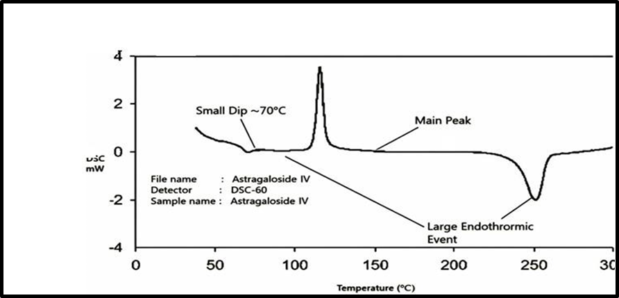 DSC studies of pure Astragaloside IV were performed. Precisely weighed samples were placed in DSC aluminium pans, and heating curves were recorded over a temperature range of 40–350 °C at a heating rate of 10 °C/min under an inert nitrogen atmosphere. The DSC thermograms were obtained using calibrated differential scanning calorimeters to analyse phase transitions and confirm drug purity and thermal stability.