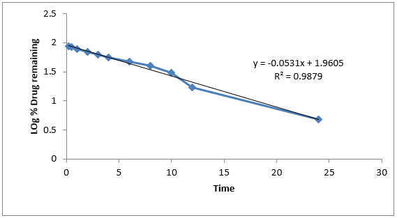 When the data is plotted as log percent drug remaining versus time yields a straight line, indicating that the release follows first-order kinetics. The constant ‘K’ can be obtained by multiplying 2.303 with slope values.