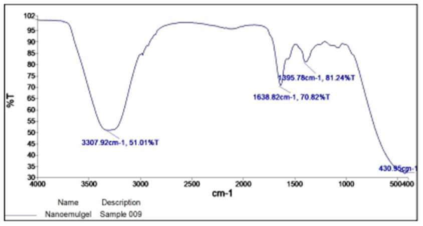 The FT-IR spectra of final formulation (F2) indicate that characteristic peak of tretinoin was not visible in the nanoemulgel spectra which indicates that oil was completely encapsulate in the nano-emulsion gel.