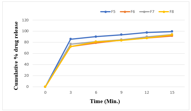 The F8 formulation was used to conduct a follow-up drug release research in phosphate buffer PH6.8. For all formulations, the percent cumulative drug release ranged from 88.27±0.5352 to 99.24±0.1401%. The higher the concentration of super disintegrants, the higher the drug release. The maximum drug release, or 99.24%, was seen in the first 15 minutes with F5 formulations.