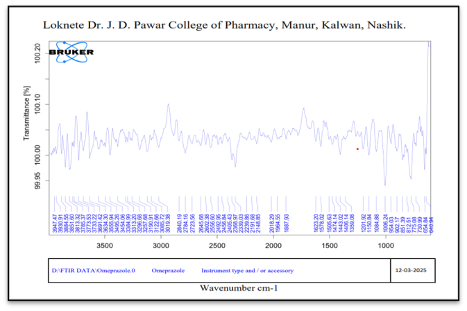 IR spectroscopy is helpful scientific method for determining how drugs interact chemically and polymer during storage. Therefore, infrared spectroscopy utilization to examine how additional excipients employed in the formulation interact chemically with the Omeprazole. The drug's IR spectra was compared to that physical mixture of drug and excipients to verify for any potential interactions between medicine excipients.4