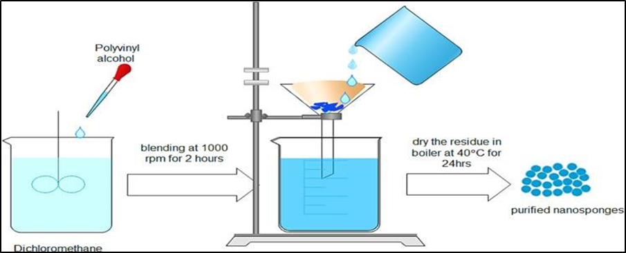 In this process, Nano sponges are made by sonicating polymers containing carbonyl cross synchronisation primitives in the absence of a solvent. These nanosponges will have a consistent spherical dimension. In a flask, combine the polymer and cross-linker in an appropriate amount. For ultrasonication, the flask is immersed in water and heated to 90°C. For continuous sonication, the mixture is held for 5 hours. The combination is then cooled, and the result is rinsed with distilled water before being purified with a Soxhlet extractor and ethanol. The final product is dried at 25 degrees Celsius, and the whitish powder is captured and processed away from dampness.