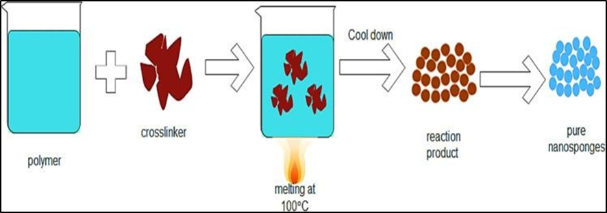 Dimethyl carbonate, diphenyl carbonate, DiIsocyanates, diaryl carbonates, carbonyl diimidazole, carboxylic acid anhydrides, and 2, 2-bis (acrylamide) acetic acid are used to make nanosponges. All of the materials are carefully homogenised before being placed in a 250 ml flask and heated to 100 ° C. Use a magnetic stirrer to agitate the reaction for around 5 hours. Allow time for the mixture to cool and the product to break down. The resulting product should next be washed with a suitable solvent to eliminate any remaining unreacted excipients and by products. Nanosponges' porosity, pore diameters, and surface charge density can all be tweaked to attach different molecules.