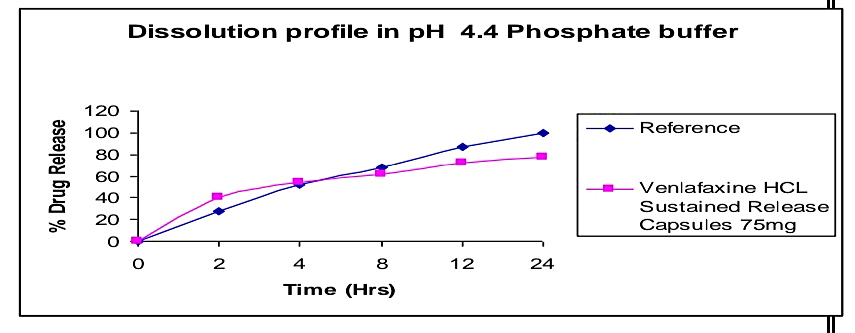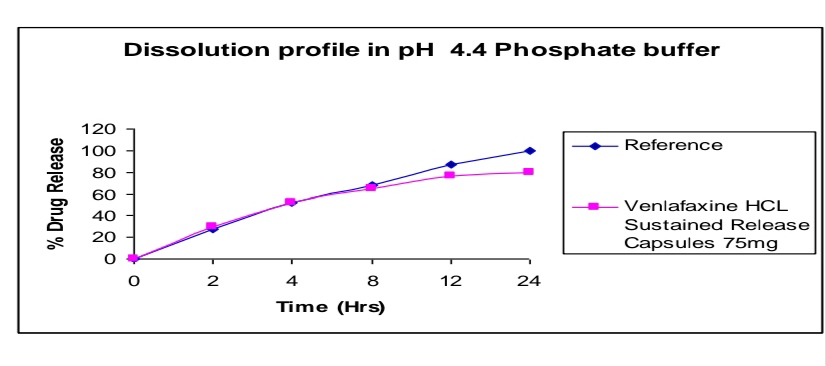 The active pharmaceutical ingredient Venlafaxine HCL was subjected to preformulation study, which encompasses the “Accelerated drug excipient compatibility study” and the results obtained with selected excipients showed good compatibility with Venlafaxine HCL. The Venlafaxine HCL SR pellets were loaded in size 2 capsules. It showed good results in formulation of stable dosage. The dissolution profile of the prepared Venlafaxine HCL SR release capsules were compared with that Venlafaxine HCL SR capsules (Wyeth) of the product. The release was found more in the case of pellets loaded in the capsules. And dissolution profile of Venlafaxine HCL SR capsules was compared with that of innovator (Wyeth). The release was found similar to that of Innovator. So the prepared product was said to be equivalent with innovator. SR release pellets have minimum volume in size, greater surface area and more surface activity. The area of the drug loaded pellets release rate was also more. And also there was no need of disintegration time for pellets in capsules. Small volumes of pellets enter into the systemic circulation very fast. Moreover there was no accumulation of drug in the body. Drug release rate was more when compared with the innovator sample. In the case of Venlafaxine HCL SR capsules (Trail 8) meet the requirement for Invitro drug release were selected for stability studies. The capsules were stored in a bottle at 40°c / 75 % RH for 60 days. After 60 days samples were withdrawn and analyze. The results are reproducible and similar to theoretical set limits. Finally I conclude like Sustained Release Pellets in capsule have more drug release rate.