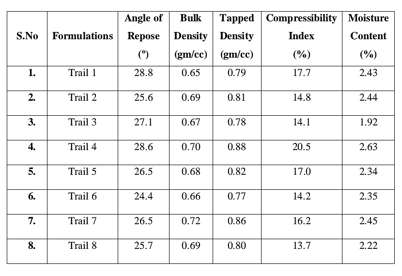 Preformulation Characteristics of blend of all formulations.