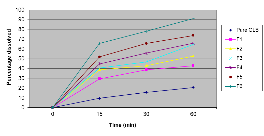 The results indicate that the prepared formulations have a different dissolution profile than the pure glibenclamide, suggesting that it is not similar, and this difference indicates a significant improvement on the efficacy of the drug.