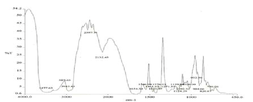 FTIR spectra of glibenclamide and its solid dispersions are identical. The principle IR absorption peaks of glibenclamide solid dispersions were observed and found to be identical with the spectra of glibenclamide pure drug. Thus, from the spectra it was understood that there was no interaction between glibenclamide and the carriers used in the preparation of solid dispersion as shown in figures 3.4, 3.5 and 3.6 respectively.