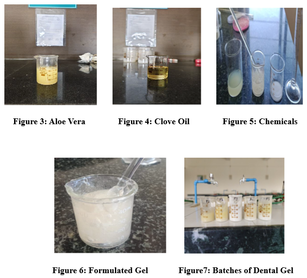 Gradually, the active ingredients, including Aloe vera extract and Clove oil, were added at the desired concentrations, with careful stirring to ensure even distribution. Finally, the remaining distilled water was used to adjust the volume of the mixture. The entire formulation was allowed to mix for an additional 15-20 minutes to ensure a consistent, smooth texture. Once the gel reached the desired uniformity, it was transferred into sterilized containers for storage and use, resulting in a stable and therapeutic gel suitable for topical or oral application.16-18