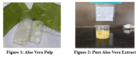 Fresh Aloe vera leaves were harvested and thoroughly rinsed with sterile distilled water followed by a mild chlorine solution after being washed under running water for 15 minutes. The leaves were then longitudinally incised, and the colorless parenchymatous tissue, known as Aloe gel, was meticulously scraped out using a sterile knife. The thick epidermis was carefully discarded, and the gel-like pulp was extracted (Figure 1 and 2), minced, and homogenized using a mixer to obtain a uniform consistency.15