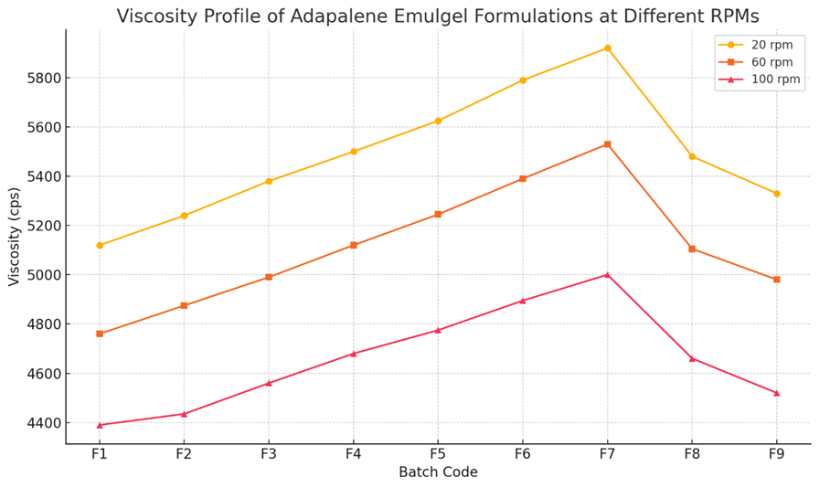 The Adapalene anti-acne emulgel was prepared using a stepwise procedure. Initially, a gel base was formed by dispersing Carbopol 934 in distilled water and allowing it to swell, while HPMC was separately dissolved and hydrated. Both were combined and mixed to obtain a homogenous gel base. For the oil phase, Adapalene was dissolved in liquid paraffin with gentle heating (60°C), and Span 20 was added as a lipophilic surfactant. Simultaneously, the aqueous phase was prepared by dissolving Tween 20, propylene glycol, and methyl paraben in distilled water, maintaining the same temperature. The aqueous phase was then added to the oil phase under continuous stirring to form a stable emulsion. This emulsion was slowly incorporated into the gel base with gentle stirring to form the emulgel. The pH was adjusted to 5.5–6.5 using triethanolamine, and the final volume was made up with distilled water. The formulation was stored in airtight containers at room temperature for further evaluation [15].