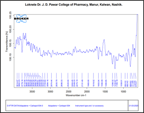 The infrared absorption spectrum of adapalene was recorded with a KBr disc over the wave number 4000 to 400 cm-1 using Fourier Transform Infrared Spectrophotometer (Agilent Technologies Cary 630, USA).