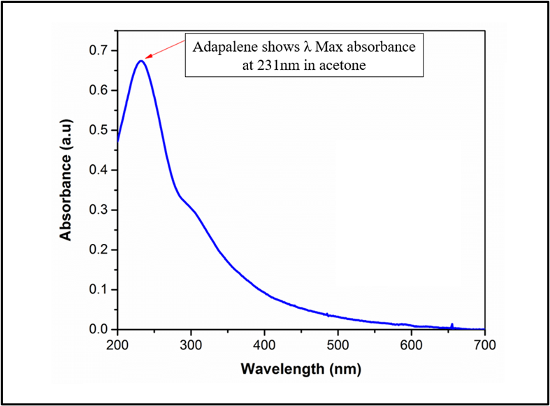 The solubility of adapalene was checked in different solvents like distilled water, methanol, ethanol, polyethylene glycol, ether, chlo, acetone, propylene glycol and phosphate buffer pH 6.5 [7,8].