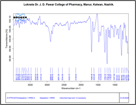 DSC was performed to study the thermal behaviour and compatibility of adapalene with the polymers and excipients used in the formulation. Thermal analysis of pure drug, polymer (Carbopol 934 and HPMC), their physical mixture and the optimized emulgel formulation was carried out using a DSC instrument. Approximately 5–10 mg of each sample was sealed in an aluminum pan and heated in the range of 30°C to 320°C at a heating rate of 10°C/min under a nitrogen atmosphere to prevent oxidative degradation. The thermograms were analysed for any shift, appearance or disappearance of melting endotherms, which could indicate physical or chemical interactions between drug and excipients [11,12].